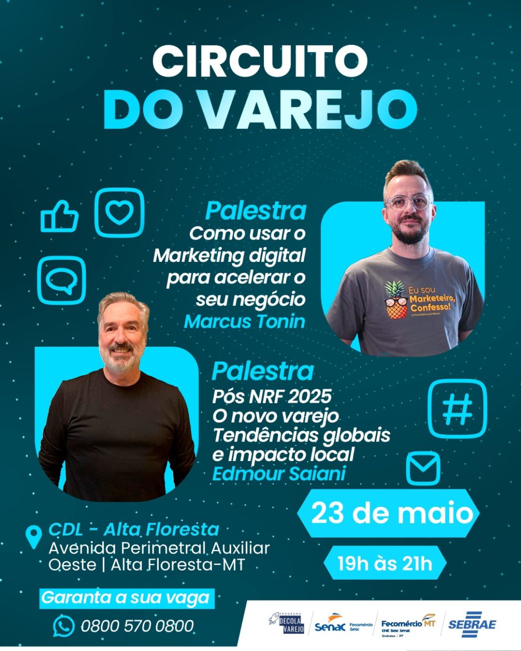 Pensando nisso, Alta Floresta recebe no dia 23 de maio o Circuito do Varejo, um evento voltado a empresários, gestores e profissionais que desejam se atualizar e ampliar sua performance de vendas. A programação inclui duas palestras de peso: “Usar o marketing digital para acelerar o seu negócio” e “Pós NRF 2025 – O novo varejo: tendências globais e impacto local”.