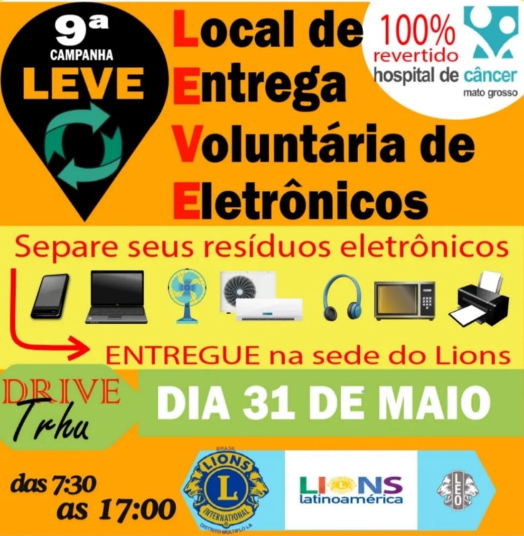 O Lions Clube de Alta Floresta está promovendo a 9ª edição da campanha leve, uma iniciativa que une sustentabilidade e empatia. A proposta é simples: arrecadar equipamentos eletrônicos sem uso durante o mês de maio e reverter todo o valor obtido com o descarte adequado para o Hospital do Câncer de Mato Grosso, em Cuiabá.
