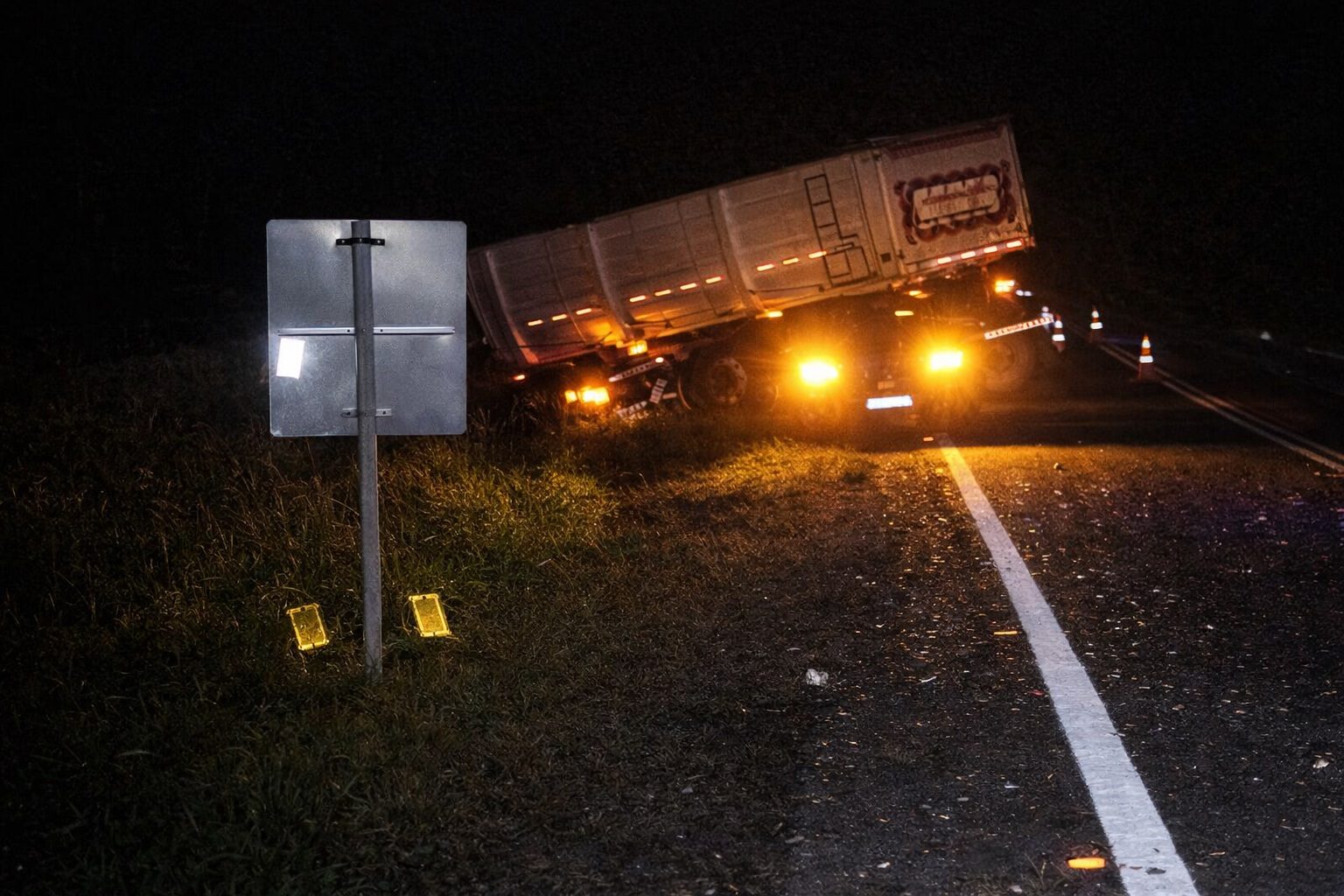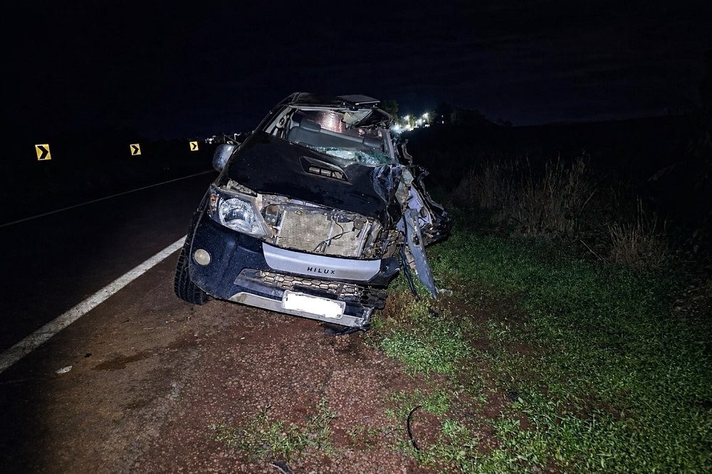 Com a força do impacto, a Hilux rodou e parou fora da pista. A carreta também saiu da pista de rolamento, com a parte traseira do último reboque bloqueando parcialmente a rodovia.