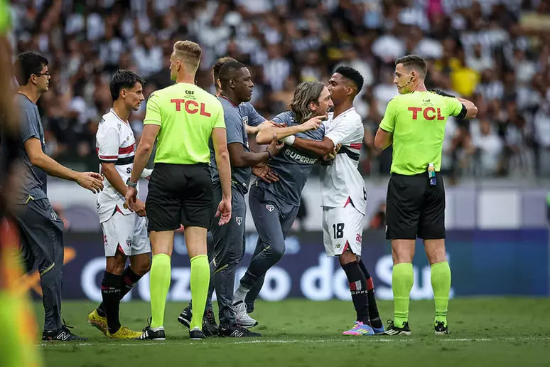 O São Paulo também ficou na bronca com a arbitragem pela não expulsão do zagueiro Lyanco, após falta forte no primeiro tempo, quando já estava amarelado. O técnico Luis Zubeldía se descontrolou e foi expulso.
