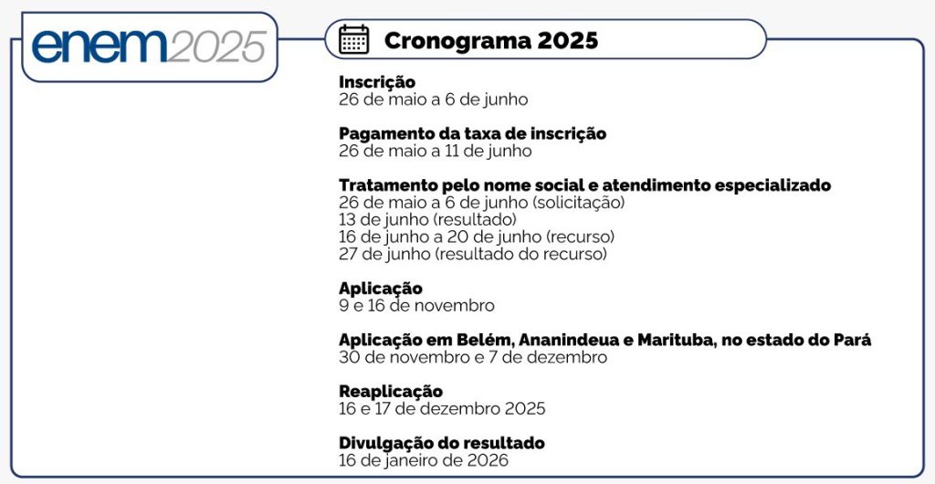 As provas nos municípios paraenses de Belém, Ananindeua e Marituba terão, excepcionalmente, outras datas de aplicação: 30 de novembro e 7 de dezembro. A medida visa atender melhor os estudantes dessas localidades, em razão dos impactos logísticos da 30ª Conferência das Nações Unidas sobre Mudanças Climáticas (COP 30), que ocorrerá no estado no período da aplicação regular do exame.