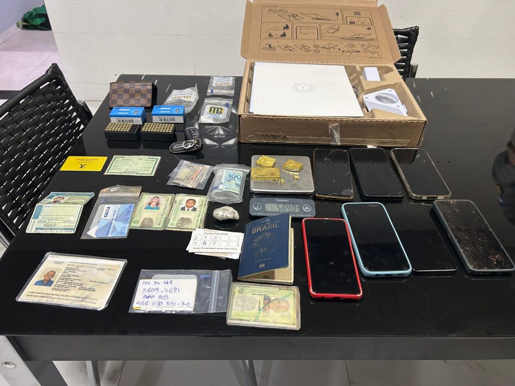 Durante a busca no imóvel, os policiais constataram que se tratava de um grupo de garimpeiros. Os seis homens — com idades de 25, 35, 43, 46, 48 e 55 anos — demonstraram nervosismo. Na revista pessoal e domiciliar, foram localizados dois celulares escondidos (um no telhado e outro sob folhas secas no quintal), uma porção pequena de substância análoga à maconha, que um dos suspeitos alegou ser para uso próprio, e, no interior de um quarto, 591,5 gramas de material com características de ouro, além de 92 munições calibre .22 (Chog Target).