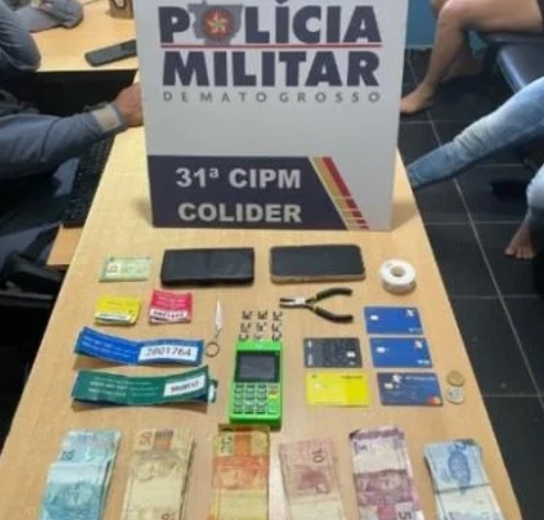 À Polícia Militar apreendeu quase 2mil em dinheiro, maquininhas de cartão, cartões bancários de terceiros e grampos.