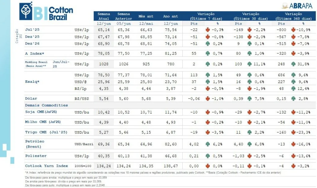 Algodão em NY – O contrato Jul/25 fechou nesta quinta 12/jun cotado a 65,14 U$c/lp (-0,3% vs. 05/jun). O contrato Dez/25 fechou em 67,47 U$c/lp (-0,8% vs. 05/jun).
